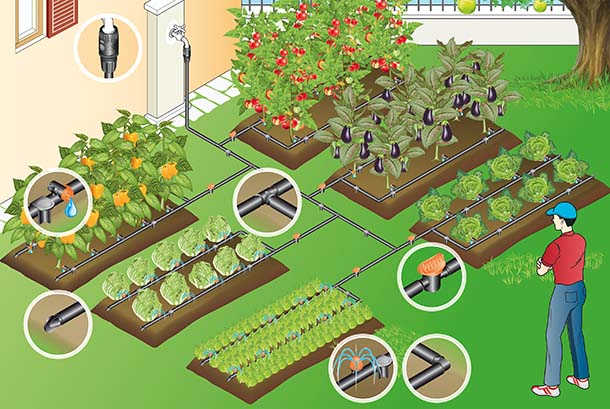 | Gravitačný systém | ![]() | Zavlažovanie z nádrže poskytuje možnosť využitia dažďovej vody. Tlak 0,05 - 0,6 bar Dĺžka zavlažovacej hadice a počet kvapkovačov sú limitované veľkosťou a polohou nádrže. |